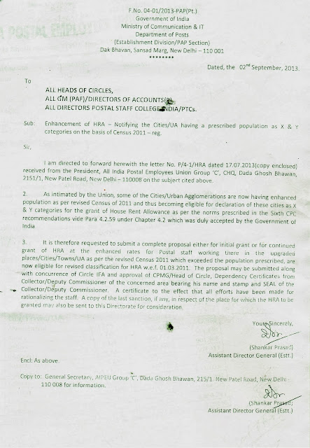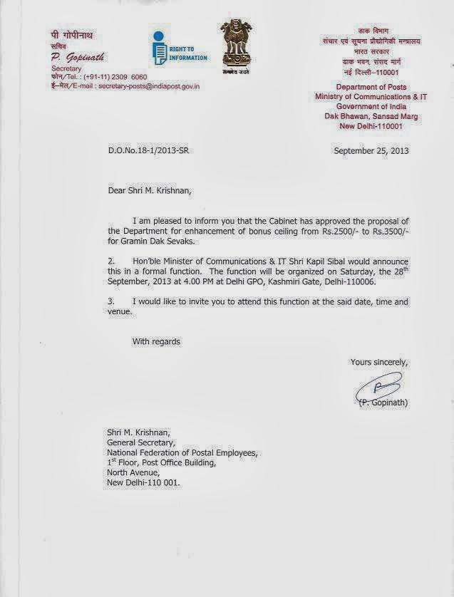 Communications & IT on 28-09-2013 regarding enhancement of GDS bonus