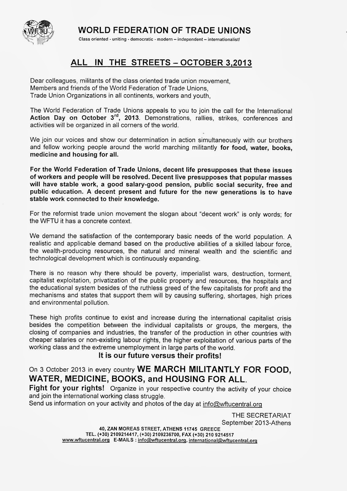 Call from World Federation of Trade