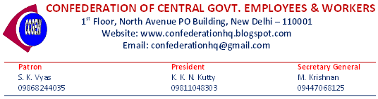 We send herewith copy of the letter from the Secretary, Staff Side, JCM intimating of the decision taken by the Staff Side to hold a National Convention at New Delhi on 11thDecember, 2014. We have already placed the said letter in our website. The decision is the outcome of the efforts the Confederation representatives in the Staff Side of the National council and must be considered a step in the right direction in pursuance of the Charter of demands, especially the important issues like wage revision, interim relief, merger of DA, scrapping of the new Pension scheme, privatization, outsourcing etc. As indicated in the letter of the Staff side Secretary, the staff side is likely to meet in the second fortnight of November, 2014 to finalize the draft declaration and the programme of action. We shall place the draft declaration on our website as and when the same is finalized.