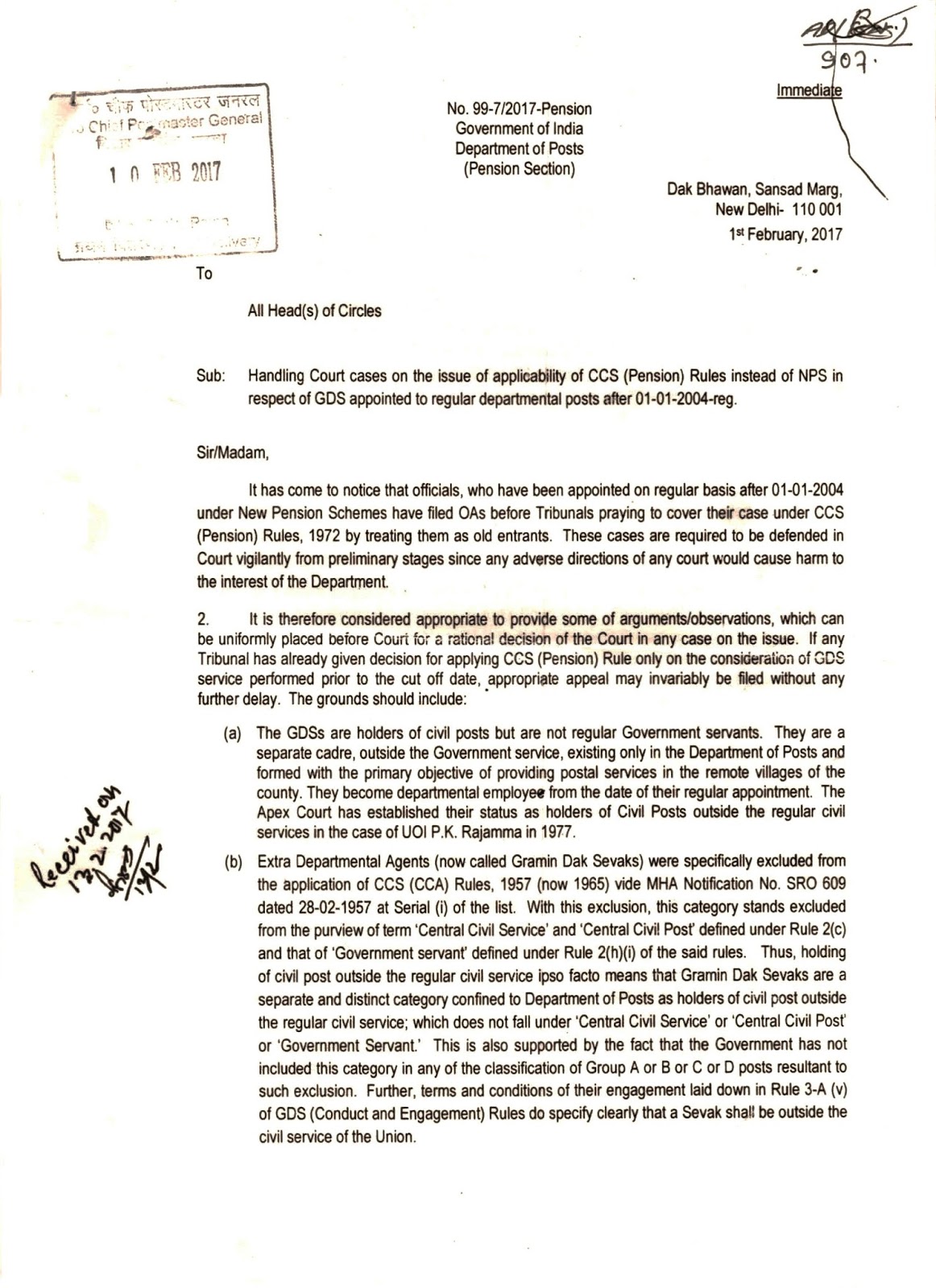 (PENSION) RULES INSTEAD OF NPS IN RESPECT OF GDS APPOINTED TO REGULAR