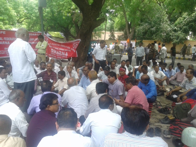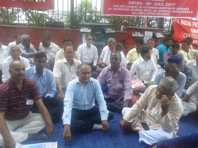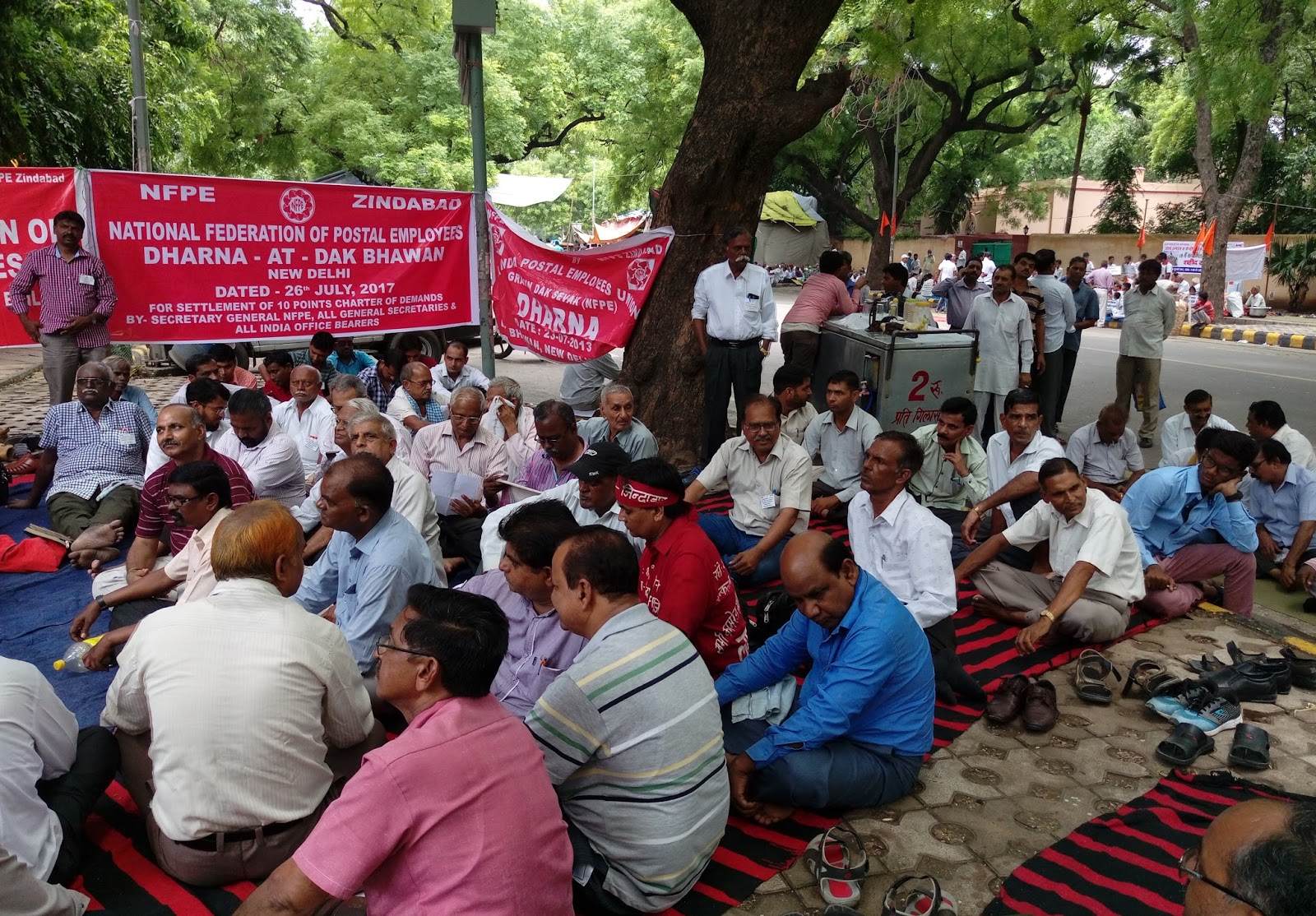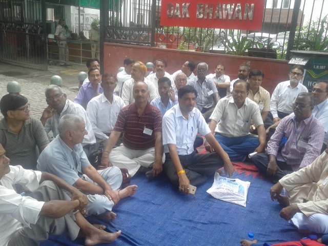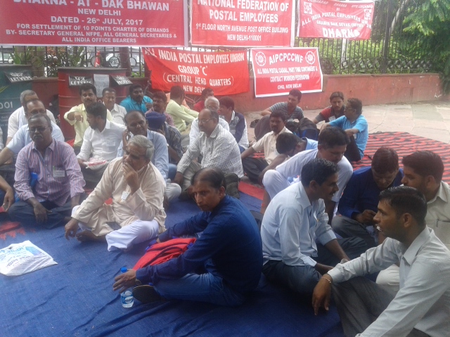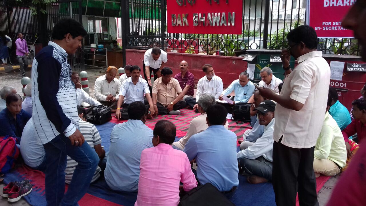 In continuation of phased agitational programme as third phase programme a massive Dharna under banner of NFPE was organized at Dak Bhawan New Delhi since 10 A.M. to 3 P.M. All General Secretaries & Secretary General NFPE lead today on date 26.07.2017 the Dharna Programme . Hundreds of All India and Circle leaders of all NFPE unions from all corners of country participated in Dharna.