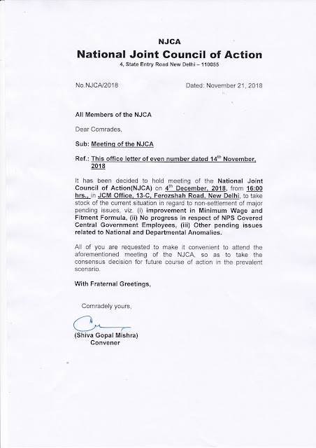A meeting of Postal J.C.A consisting of NFPE, FNPO, AIPEU GDS and NUGDS was held at NFPE office, North Avenue, New Delhi on 15-11-2018. All General Secretaries of NFPE, FNPO and GDS Unions participated in the meetings.