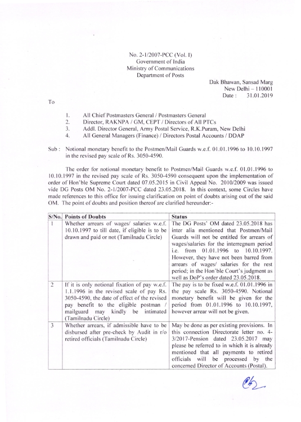 NOTIONAL MONETARY BENEFITS TO POSTMAN/MAIL GUARDS W.E.F01.01.1996 TO 10.10.1997 IN THE REVISED PAY SCALE OF RS. 3040-4590